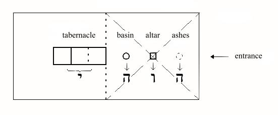 1) In the courtyard there were 1 + 3 special places, separated in the two squares of the courtyard: The 1-part was the tabernacle itself in the second square of the courtyard. The 3-part was in the first square of the courtyard namely the basin, the altar and the place for the fatty ashes (Leviticus 1:16):